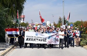 Afyon Kocatepe Üniversitesi (AKÜ) akademik ve idari personeli ile öğrencileri, İsrail’in Gazze’ye yönelik saldırılarını protesto etmek ve Küresel Sumud Filosu’na destek vermek amacıyla, eğitim-öğretim yılının beşinci gününde de yürüyüşlerine devam etti.