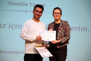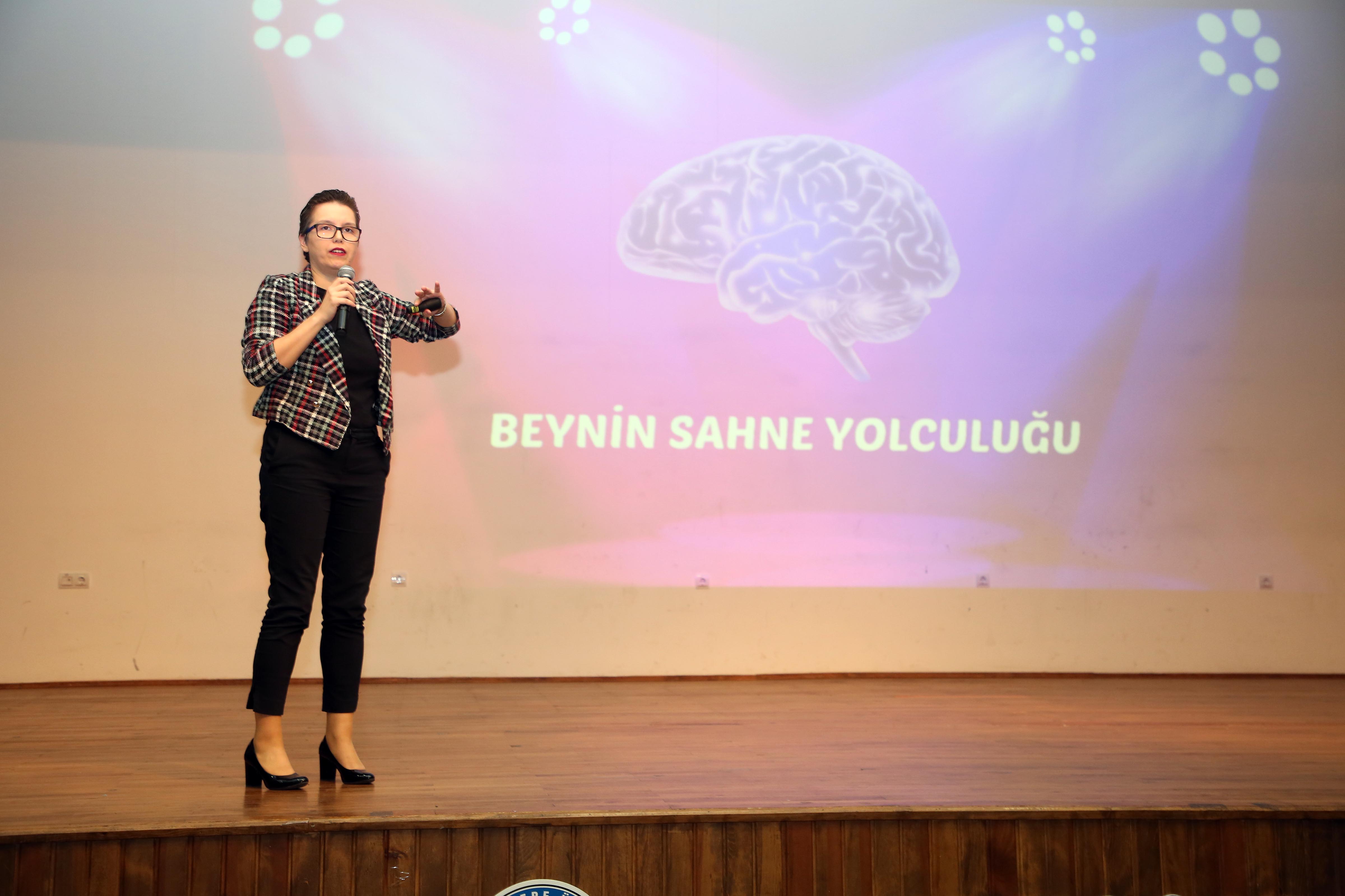 İbrahim Küçükkurt Konferans Salonunda Nörobilim Uzmanı Dr. Cemre Hoşcan Gökber’in konuşmacı olarak yer aldığı konferansa; öğretim elemanları ve öğrenciler katıldı. Beynin anatomik yapısı ve işlevleri hakkında bilgiler veren Gökber, “Acı hissetmeyen tek organımız, beyindir. Beyin asla kendisi acı çekmiyor. Beynin en güçlü lobu; frontal lob kısmıdır. Beynimizde; 100 milyar nöron vardır. Nöronlar elektrik sistemiyle çalışırlar. Ne kadar elektrik üretirlerse o kadar iyi olur. Akut durumlarda; deprem, sahne ya da kendimizi rahatsız edeceğimiz durumlarda beynimiz kendini kapatıyor. Amigdala dediğimiz küçük bölge var o devreye giriyor” diye konuştu. Beyinde akson ve snaptik bağların olduğunu kaydeden Gökber, “Çok güçlü elektrik akımı ile birbirini yenileyen sistem var. Elektrik akımı kesilmeye başladığında orada nörodejeneratif hastalıklar ortaya çıkıyor. Erken yaşta yapılan her yatırım beyin için hazinedir. Çünkü son araştırmalar gösterdi ki alzheimer yaşı 19’a indi” dedi.