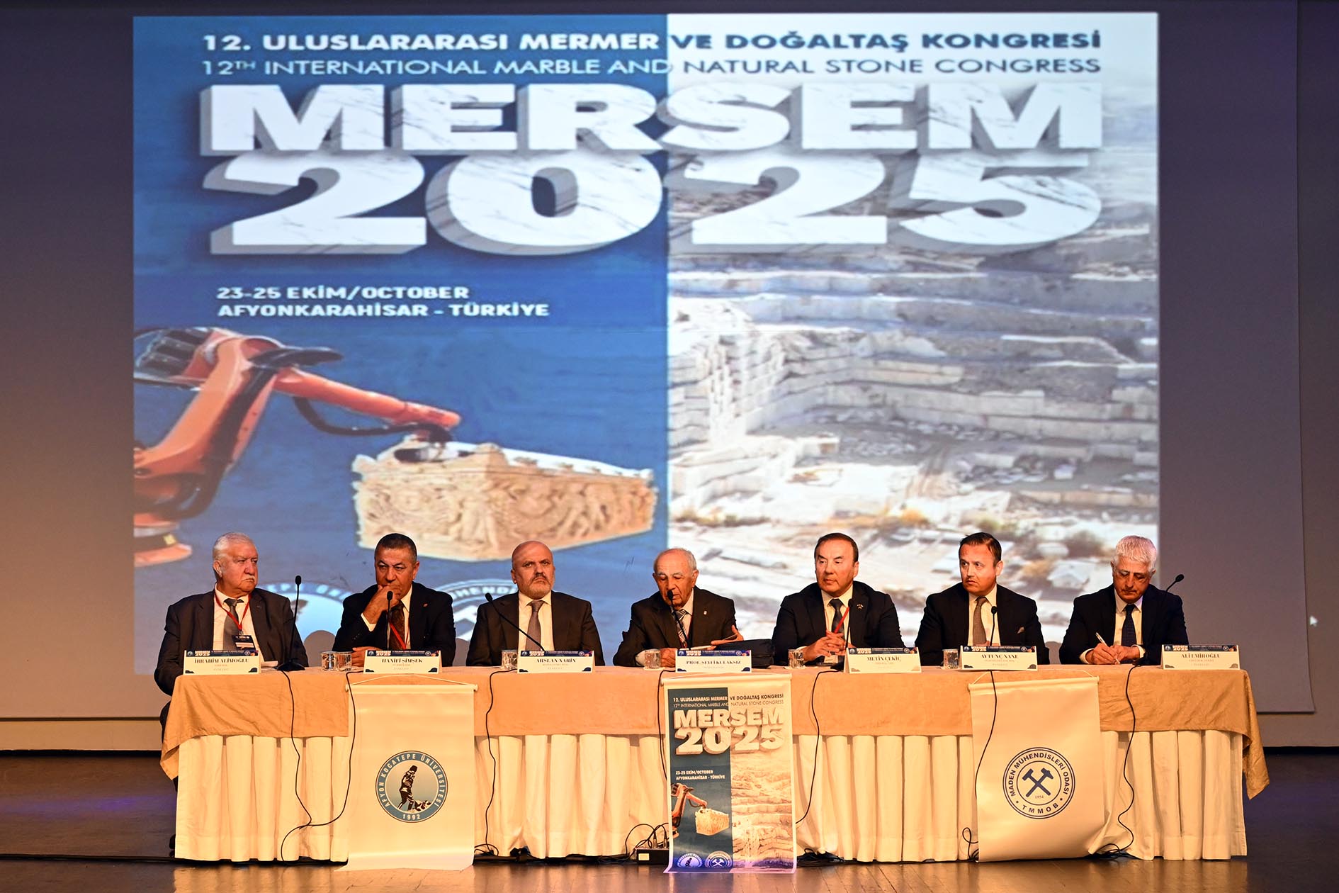 Afyon Kocatepe Üniversitesi (AKÜ) ev sahipliğinde ve Türk Mühendis ve Mimar Odaları Birliği (TMMOB) Maden Mühendisleri Odası iş birliğiyle 12. Uluslararası Mermer ve Doğaltaş Kongresi (MERSEM’25) kapsamında “Türkiye’de Mermer ve Doğal Taş Madenciliğinin Geleceği, Katma Değeri-Verimliliği ve Çevre” konulu panel düzenlendi.
