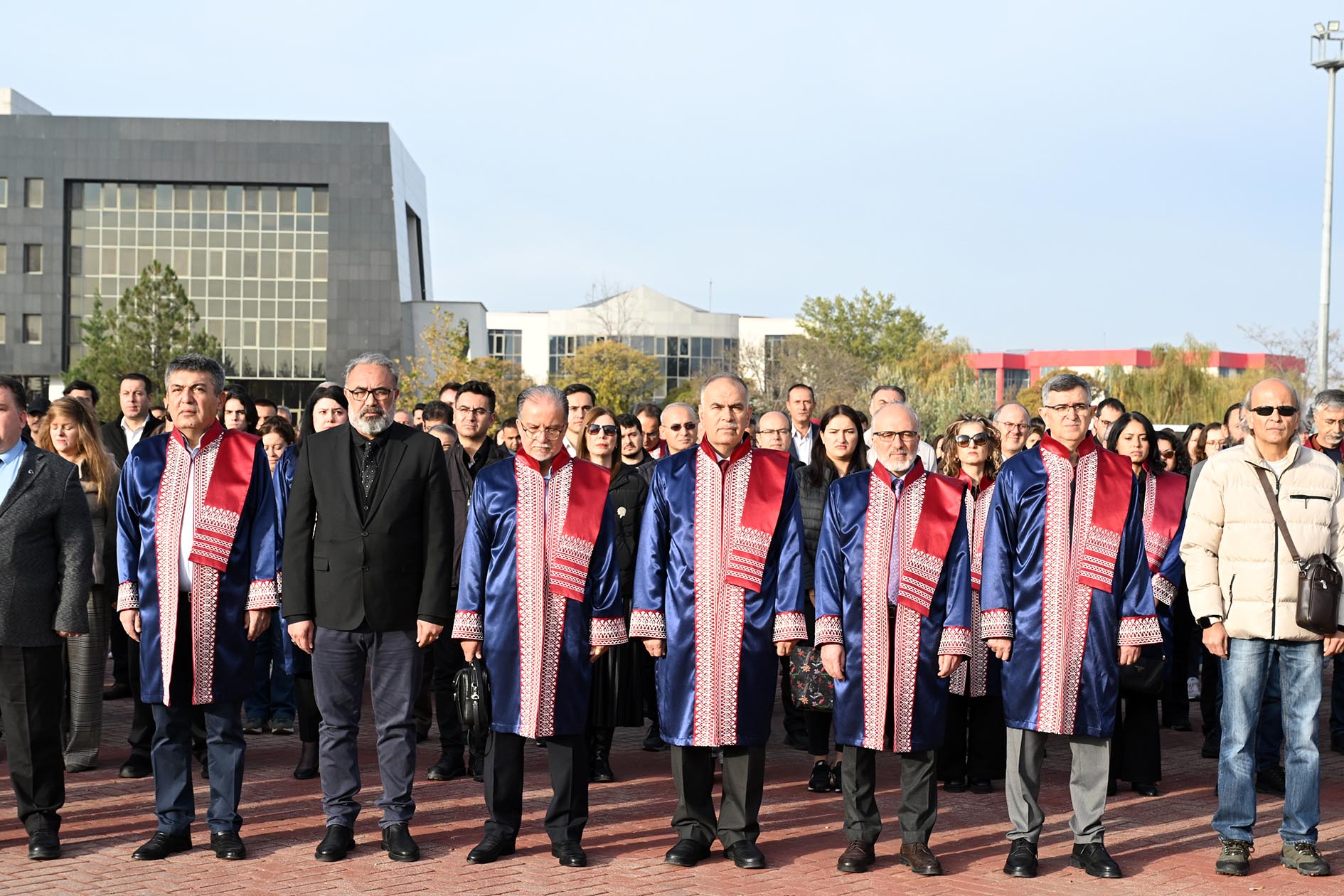Saat 09.05’te yapılan saygı duruşunun ardından İstiklal Marşı okundu. Törene AKÜ Rektör Yardımcısı Prof. Dr. Murat Peker ile enstitü müdürleri, fakülte dekanları, yüksekokul ve meslek yüksekokulu müdürleri, öğretim elemanları ve idari personel katıldı.