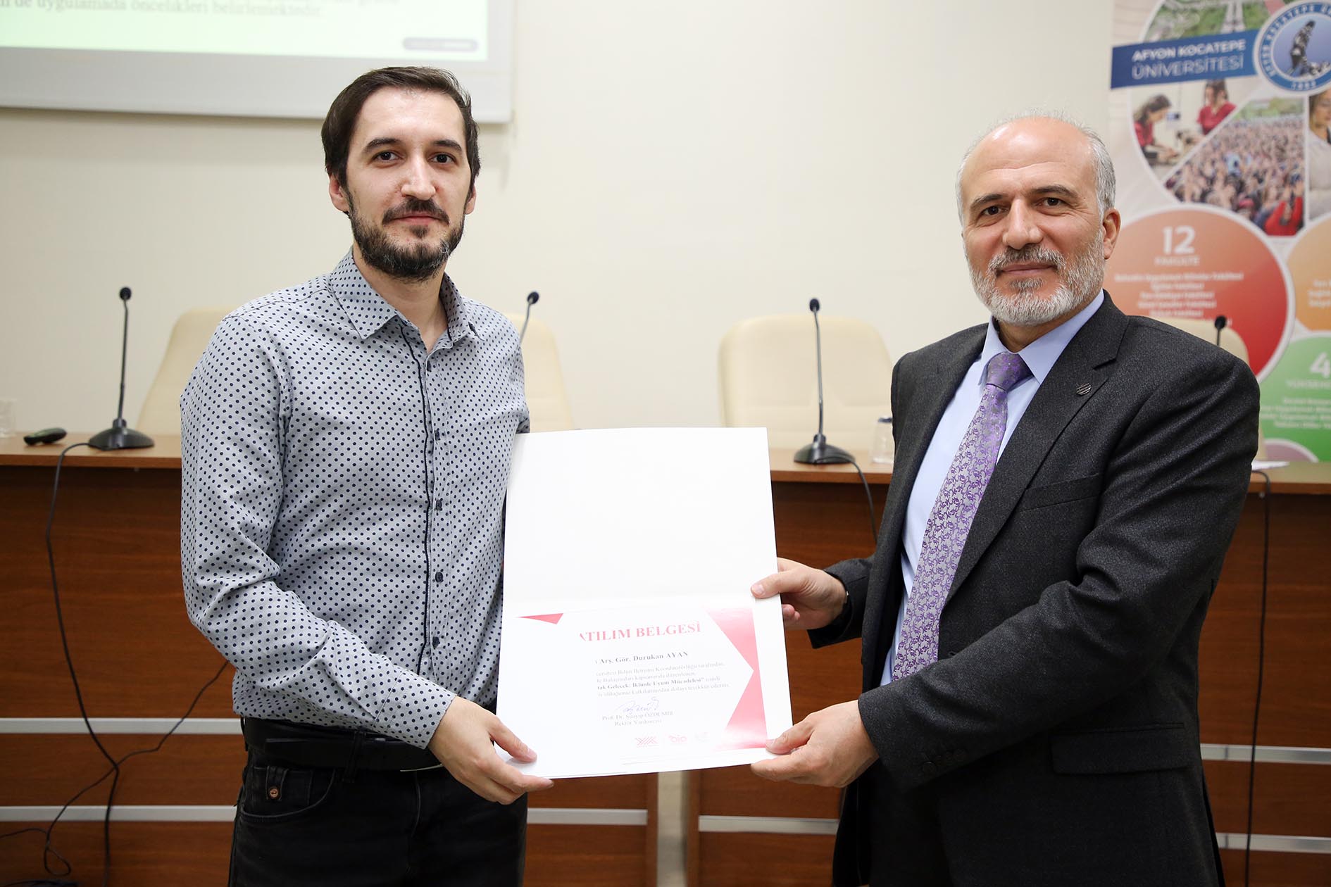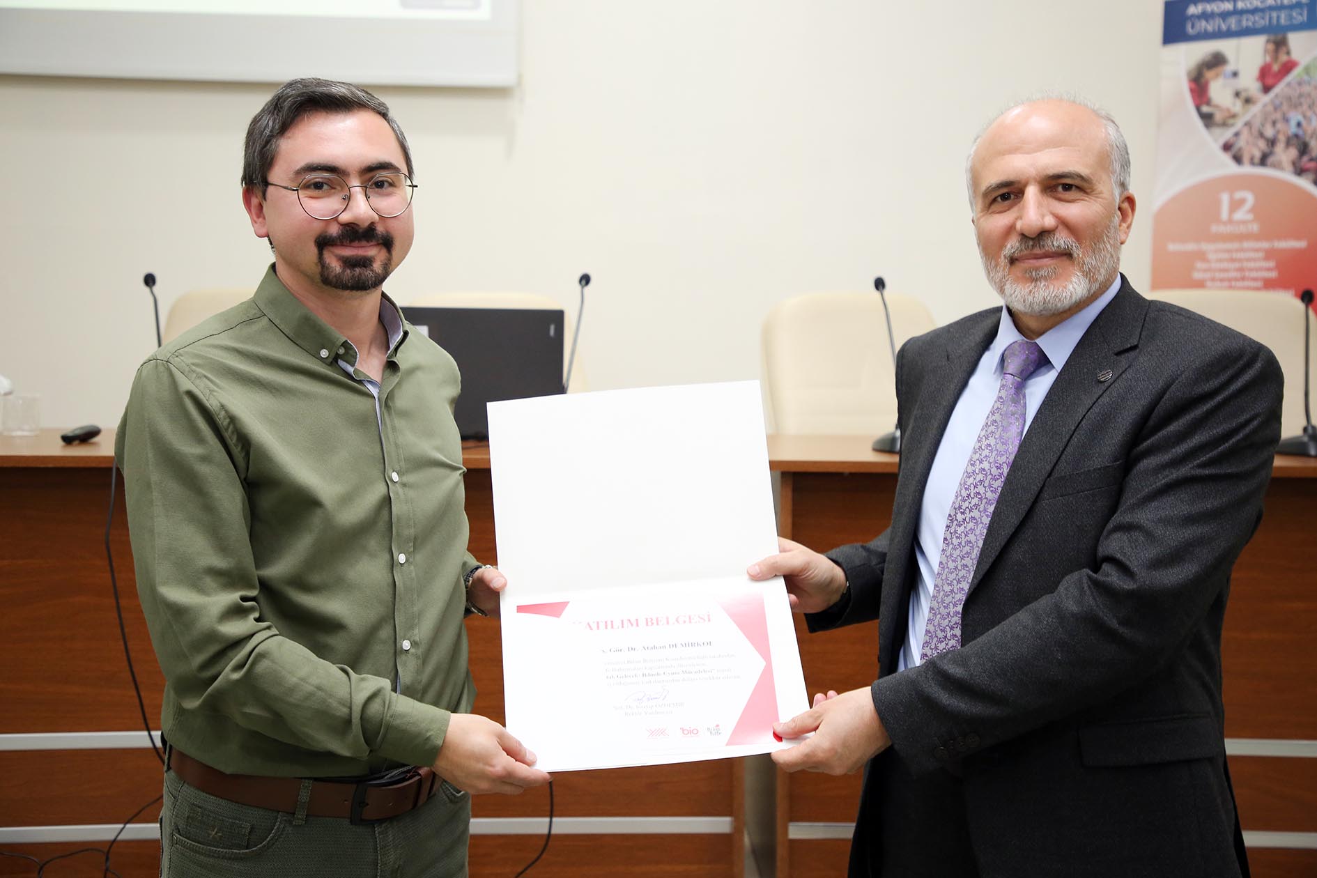 Söyleşi, soru cevap bölümünün ardından katılımcılara AKÜ Rektör Yardımcısı Prof. Dr. Murat Peker tarafından teşekkür belgelerinin takdim edilmesiyle sona erdi.