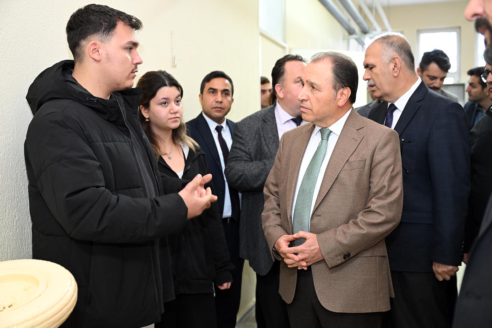 “İlçe ziyaretleri gerçekleştiriyoruz. Toplam 12 ilçede okulumuz bulunuyor. Bugün de Dazkırı ve Dinar ziyaretlerimizi yapıyoruz. Bu kapsamda hem yöneticilerimiz, hem akademisyenlerimiz hem de öğrencilerimizle bir araya geliyor; taleplerini, değerlendirmelerini ve önerilerini dinliyoruz. Ayrıca okul ile ilçe yönetimi arasındaki ilişkileri güçlendirmek amacıyla ilçenin yöneticileriyle de görüşüyoruz. Aslında bu ziyaretleri daha önce de yapmayı planlamıştık ancak pandemi ve deprem gibi çeşitli nedenlerle ertelemek zorunda kaldık. Dazkırı’ya bu beşinci gelişim. Taleplerimizi ve okulumuzun ihtiyaçlarını genellikle müdürümüz aracılığıyla alıyoruz; ancak gittiğimiz ilçelerde hocalarımızın farklı değerlendirme ve talepleri de olabiliyor. Meslek yüksekokullarımızın tüm ihtiyaçlarını gidermeye çalışıyoruz, fakat önceliği acil olanlara veriyoruz. Mevcut imkânlara göre planlamamızı yapıyoruz. Dazkırı’da da yeni binamızın kapasitesi yeterli; mevcut ihtiyaçları da karşılayacağız.”