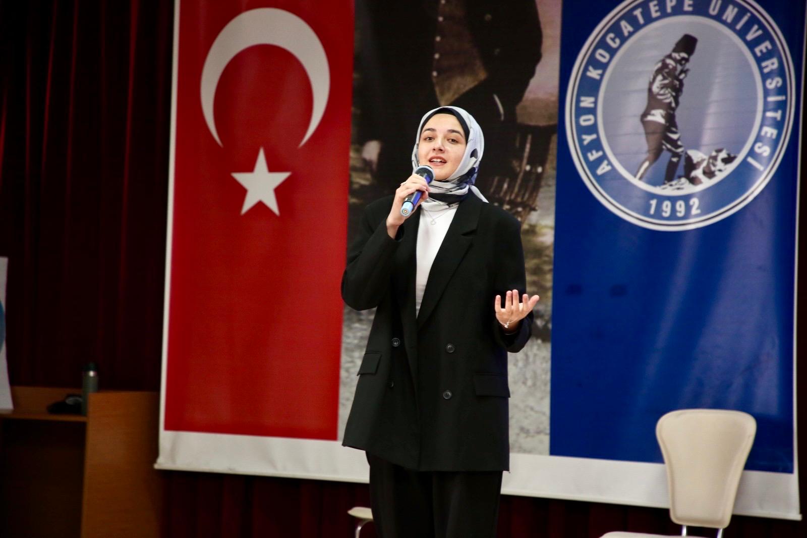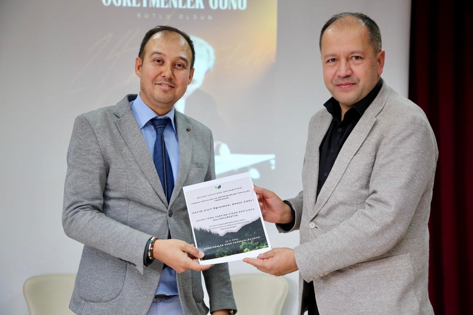Programın açış konuşmasını yapan AKÜ Rektör Yardımcısı Prof. Dr. Murat Peker, öğretmenliğin kutsal olduğu kadar büyük sorumluluk gerektiren bir meslek olduğunu belirtti. 10 Ocak 2001’de kurulan AKÜ Eğitim Fakültesinin 25. yılını kutlamaya hazırlandıklarını kaydeden Peker, fakültenin bu süre zarfında 8 bin 546 mezun verdiğini ifade etti. Peker, “Bugün itibarıyla 8 bin 546 mezun verdik. Bunun yanı sıra 8 bin 810 öğrencimize pedagojik formasyon sertifikası vererek onları öğretmenliğe aday olarak uğurladık. Kendileri şu anda eğitim ordusunun içinde yer almaktadır” dedi. Peker, AKÜ Eğitim Fakültesinin 9 lisans, 9 tezli yüksek lisans ve 3 doktora programıyla hem öğretmen yetiştirdiğine hem de öğretmenlerin mesleki gelişimlerine katkı sağladığına dikkat çekti. İlim tahsili yolunun öğrencilerin zihinsel gelişimlerini kolaylaştırmaktan, manevi yönlerini güçlendirmekten ve onlara vizyon kazandırmaktan geçtiğini kaydeden Peker, “Bizler, ‘beşikten mezara kadar ilim tahsil etmeyi’ emreden, kalemin kılıçtan üstün olduğunu vurgulayan bir medeniyetin mensuplarıyız. Çağın ve geleceğin becerileriyle donanmış, bu donanımı insanlığın hayrına kullanabilen, kültürümüze meraklı ve duyarlı, nitelikli ve ahlaklı nesiller yetiştirmek temel gayemizdir” diye konuştu.