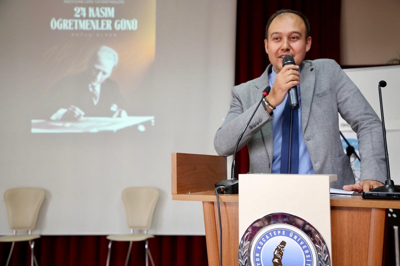 Afyon Kocatepe Üniversitesi (AKÜ) Eğitim Fakültesinde “24 Kasım Öğretmenler Günü Programı” düzenlendi. Abdullah Kaptan Konferans Salonunda düzenlenen programa; AKÜ Rektör Yardımcısı Prof. Dr. Murat Peker, Eğitim Fakültesi Dekan Yardımcıları Doç. Dr. Eray Eğmir ve Doç. Dr. Mehmet Erkol, akademik ve idari personel ile Hoca Ahmet Yesevi İlkokulu öğretmenleri ve öğrencileri katıldı.
