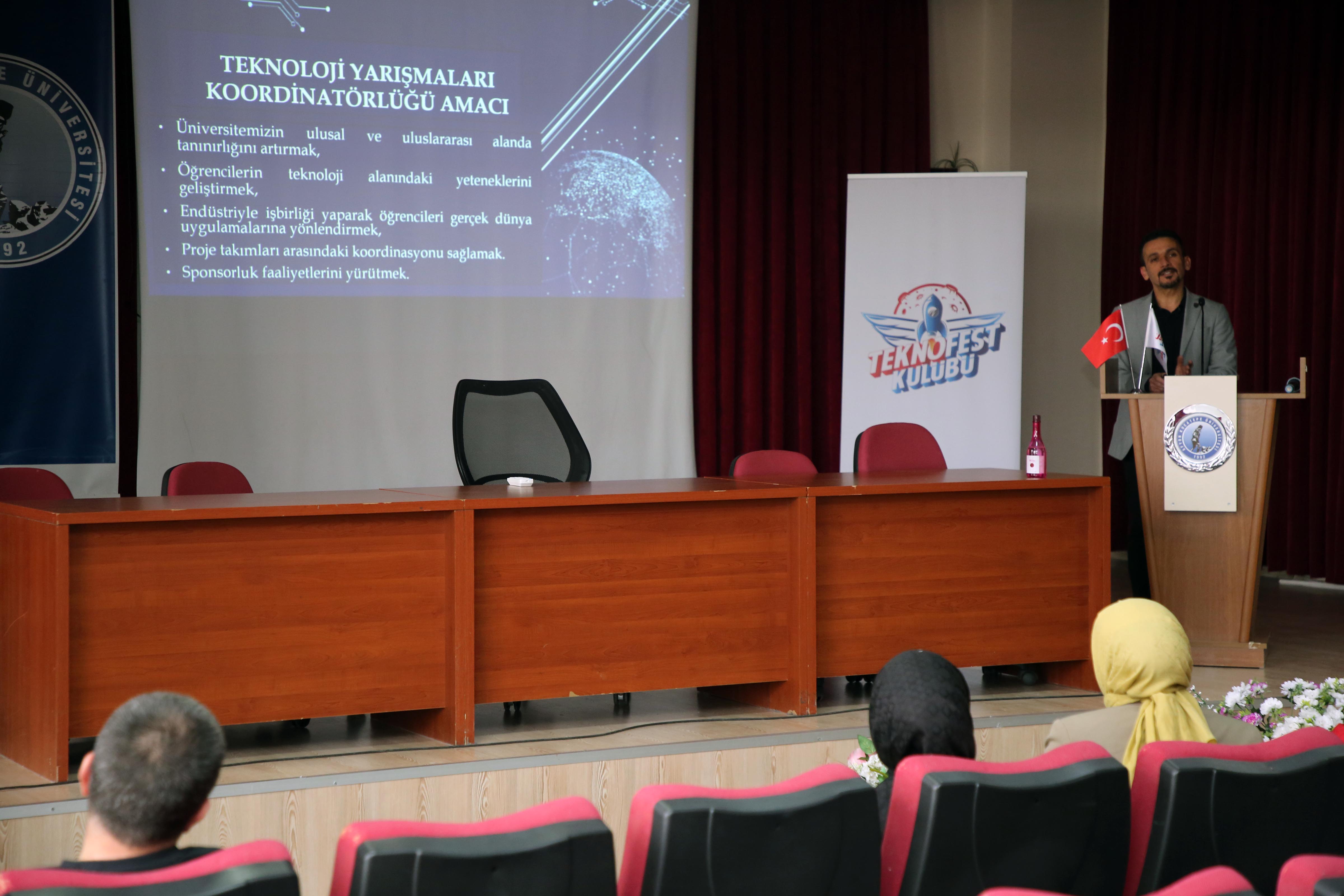 Abdullah Kaptan Konferans Salonunda düzenlenen öğrenci buluşmaları etkinliğinde; Türkiye Teknoloji Takımı Vakfı Afyonkarahisar İl Sorumlusu Doç. Dr. Mustafa Yalçın ve Teknoloji Yarışmaları Koordinatörü Dr. Öğretim Üyesi Ahmet Kaysal, Eğitim Fakültesi ve Fen Edebiyat Fakültesi öğrencilerine TEKNOFEST süreçlerine dair bilgiler verdi.