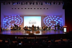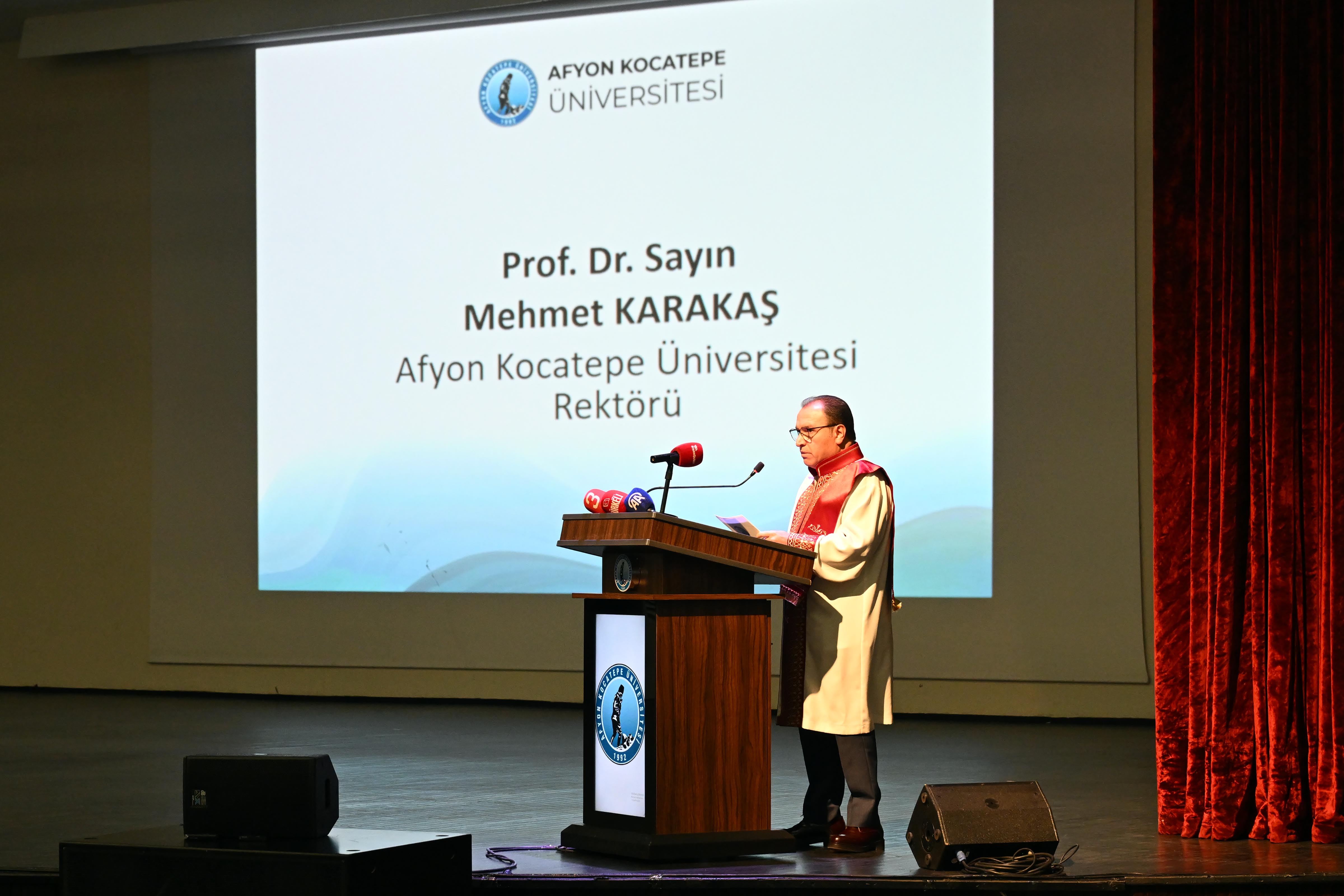 Saygı Duruşu ve İstiklal Marşı ile başlayan tören, AKÜ Tanıtım Filminin İzlenmesi ve Devlet Konservatuvarı müzik dinletisi ile devam etti. Törenin açış konuşmasını yapan AKÜ Rektörü Prof. Dr. Mehmet Karakaş, Türkiye Cumhuriyetinin ikinci yüzyılında kadim şehir Afyonkarahisar’da kök salan Afyon Kocatepe Üniversitesinin geleceğe emin adımlarla yürüdüğünü belirtti. Karakaş, “Kökleri 1974’e uzanan ve 1992 yılında çıkan kanunla üniversiteleşen Afyon Kocatepe Üniversitesi, bünyesinden iki üniversite çıkaran, 185 bini aşkın mezunu, farklı alanlardaki nitelikli yayın ve araştırmaları ile ilimizin ve ülkemizin gelişimine katkı sağlayan saygın ve köklü bir üniversitedir” dedi.