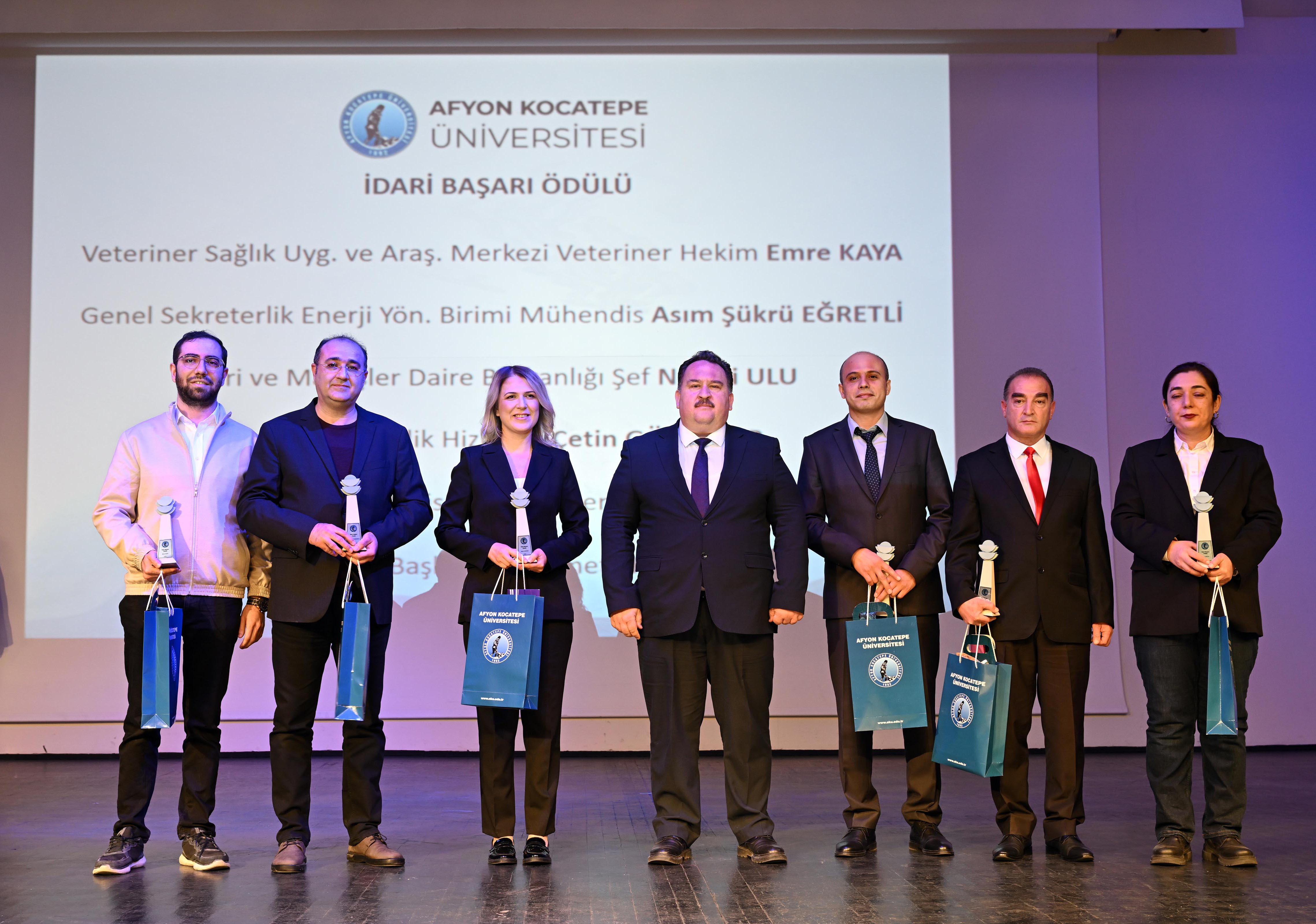 Veteriner Sağlık Uygulama ve Araştırma Merkezinden Veteriner Hekim Emre Kaya, Genel Sekreterlik Enerji Yönetim Biriminden Elektrik Mühendisi Asım Şükrü Eğretli, İdari ve Mali İşler Daire Başkanlığından Şef Necati Ulu, Genel Sekreterlikten Hizmetli Çetin Gökbınar, Eğitim Fakültesinden Bilgisayar İşletmeni Yelda Çolpan ve Personel Daire Başkanlığından Hizmetli Huri Çapun idari başarı ödülü ile taltif edildi.