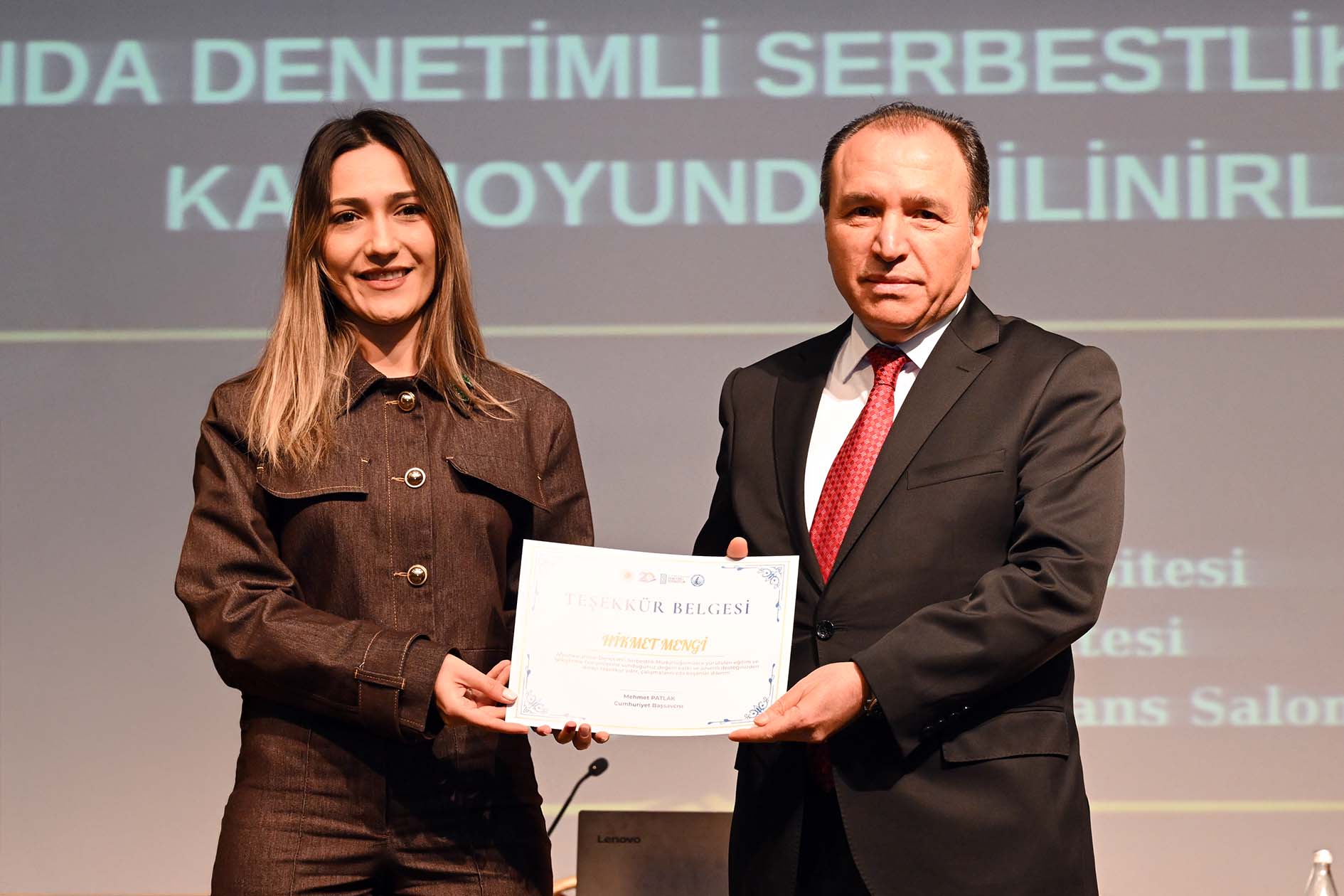 Eğitim Fakültesi Rehberlik ve Psikolojik Danışmanlık Bölümünden Dr. Öğretim Üyesi Tuğba Turgut ise Denetimli Serbestliğin dünyadaki farklı uygulama modellerini anlattı. Amerika Birleşik Devletlerindeki “Uyuşturucu Mahkemeleri” modelinin katı ve davranışçı bir yapıya sahip olduğunu belirten Turgut, Hollanda modelinin ise 200 yıllık bir geçmişe sahip olduğunu ve sivil toplum kuruluşları tarafından yürütüldüğünü belirtti. İskandinav ülkelerinde “normalleşme” ilkesinin, Avustralya’da ise “terapötik hukuk” modelinin uygulandığını kaydeden Turgut, “Türkiye modeli ise Adalet ve Sağlık Bakanlıkları iş birliğinde, AMATEM ve Yeşilay entegrasyonuyla yürütülen, ceza adaleti sistemi içine yerleşik güçlü bir modeldir. Yapılan uluslararası araştırmalar, bu modellerin hepsinde yeniden suç işleme oranlarının anlamlı ölçüde düştüğünü göstermektedir” diye konuştu.