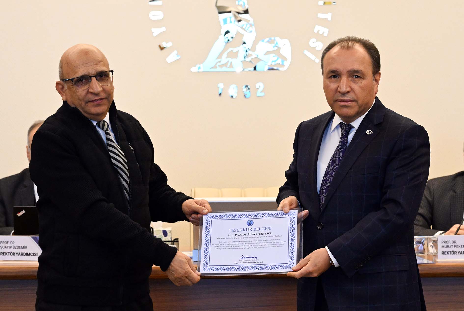AKÜ akademik birimlerindeki akreditasyon sürecinde gösterdikleri liderlik ve özverili çalışmalarından dolayı Fen Edebiyat Fakültesi Dekanı Prof. Dr. Hüseyin Koçak, Kimya Bölüm Başkanı Prof. Dr. Ömer Hazman, Tarih Bölüm Başkanı Prof. Dr. Gürsoy Şahin, Mühendislik Fakültesi Dekanı Prof. Dr. İsmail Zorluer, Biyomedikal Mühendisliği Bölüm Başkanı Prof. Dr. Levent Özcan, İnşaat Mühendisliği Bölüm Başkanı Prof. Dr. Gökhan Görhan, Spor Bilimleri Fakültesi Dekanı ve Beden Eğitimi ve Spor Öğretmenliği Bölüm Başkanı Prof. Dr. Yücel Ocak, Turizm Fakültesi Dekanı ve Turizm Rehberliği Bölüm Başkanı Prof. Dr. Elbeyi Pelit, Gastronomi ve Mutfak Sanatları Bölüm Başkanı Prof. Dr. Mustafa Sandıkcı, Turizm İşletmeciliği Bölüm Başkanı Prof. Dr. Ahmet Baytok ile Veteriner Fakültesi Dekanı Prof. Dr. Turan Civelek’e teşekkür belgeleri AKÜ Rektörü Prof. Dr. Mehmet Karakaş tarafından verildi. FEDEK tarafından 2025 yılında ilk kez genel değerlendirmeleri yapılan Fen Edebiyat Fakültesi Matematik, Moleküler Biyoloji ve Genetik ile Sosyoloji programlarının Bölüm Başkanlarına da AKÜ Senatosu huzurunda teşekkür belgesi verildi. Rektör Karakaş, Matematik Bölüm Başkanı Prof. Dr. Mustafa Kemal Yıldız, Moleküler Biyoloji ve Genetik Bölüm Başkanı Prof. Dr. Ahmet Serteser ve Sosyoloji Bölüm Başkanı Prof. Dr. Hüseyin Koçak’ı, tebrik ederek teşekkür belgelerini takdim etti.