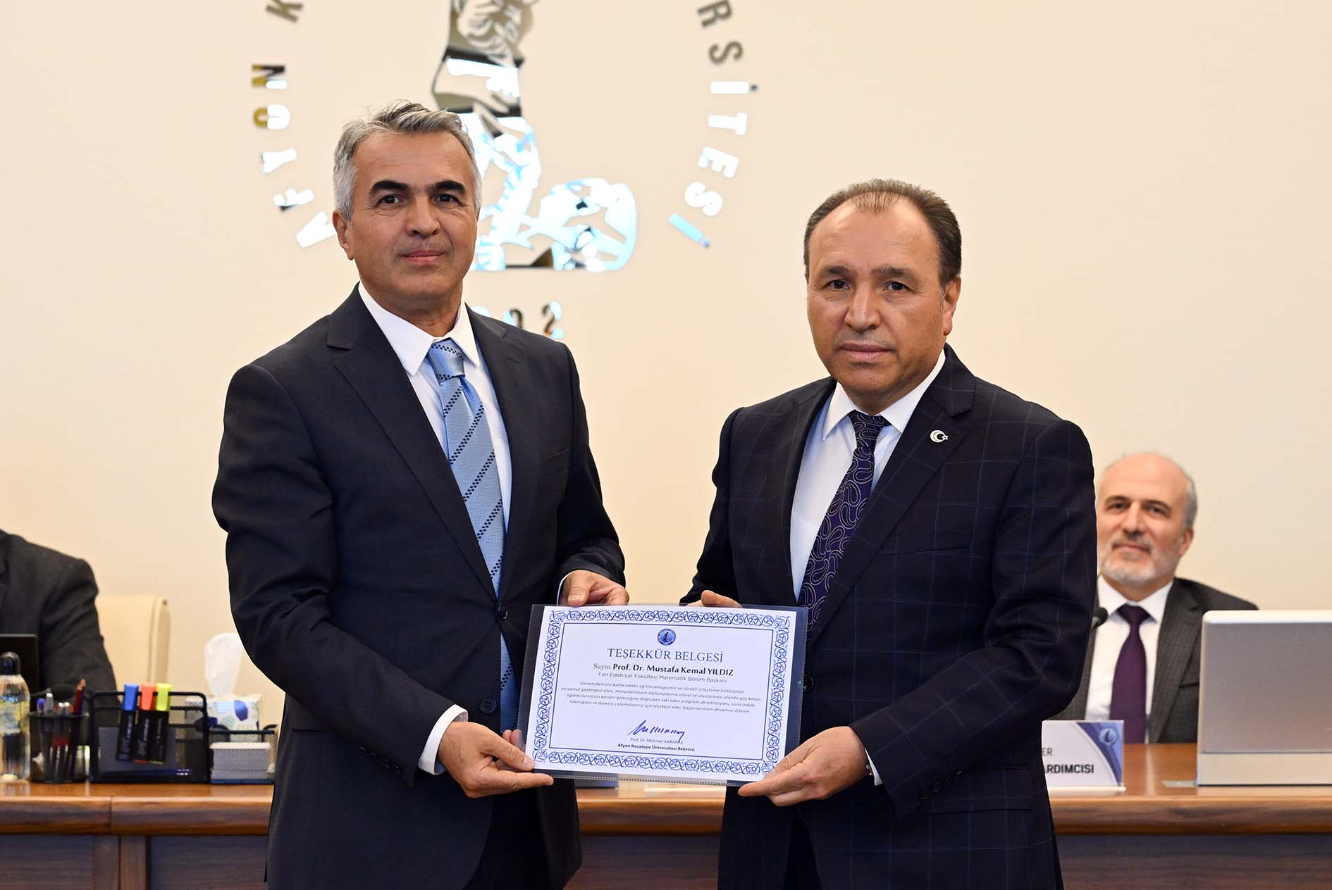 Afyon Kocatepe Üniversitesi (AKÜ) Rektörü Prof. Dr. Mehmet Karakaş, Üniversite kurumunun temel misyonları olan eğitim öğretim, araştırma geliştirme, toplumsal katkı ve liderlik alanlarında kalite düzeyini değerlendiren akreditasyon çalışmaları başlatan ve bu süreçteki liderlikleri, özverili çalışmaları ve başarılı sonuçlar almalarından dolayı bölüm başkanları ile ilgili dekanlara AKÜ Yönetim Kurulunda teşekkür belgesi takdim etti.