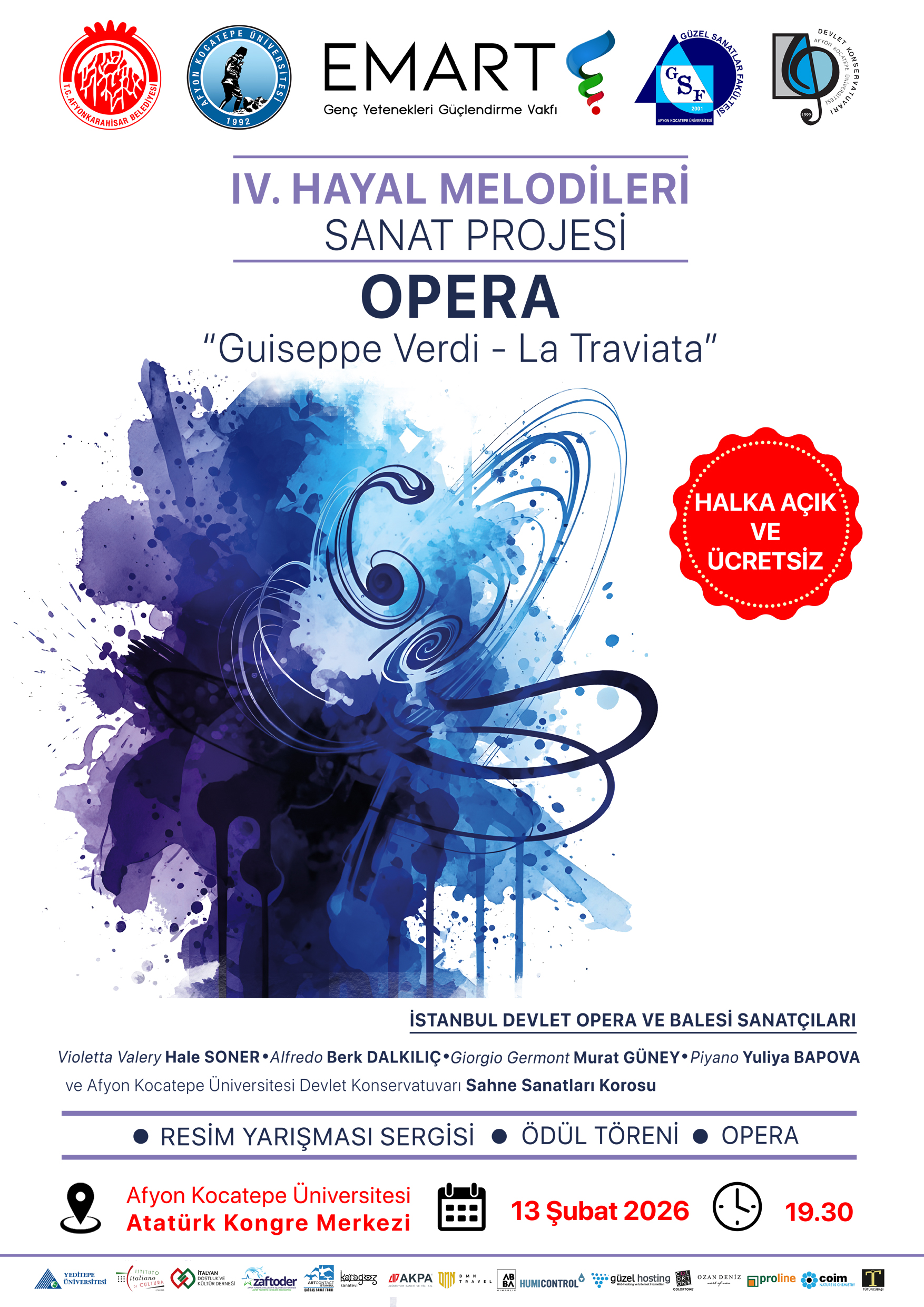 13 Şubat Cuma günü, saat 19.30’da AKÜ Ahmet Necdet Sezer Kampüsü Atatürk Kongre Merkezinde düzenlenen program, yarışma jürisi tarafından 150’ye yakın başvuru arasından başarı ödülüne ve sergilemeye layık görülen eserlerden oluşan karma serginin açılışıyla başlayacak, ödül töreninin ardından sahnelenecek “La Traviatta Operası”, halka açık ve ücretsiz olarak gerçekleştirilecek.