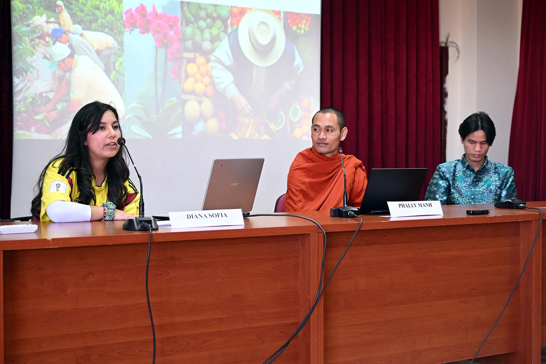Kamboçyalı öğrenciler Khem Nvaeng ve Phaly Manh ise Güneydoğu Asya’da yer alan Kamboçya’nın tarihi, kültürü ve gelenekleri hakkında bilgi verdi. Phaly Manh konuşmasında, Kamboçya’nın yalnızca turistik mekânlardan ibaret olmadığını; aynı zamanda güçlü bir maneviyat ve misafirperverlik kültürüne sahip olduğunu belirttti. Kamboçya denildiğinde akla gelen en önemli yapılardan birinin Angkor Wat Tapınağı olduğunu belirten Manh, “Kamboçya Anayasası’na göre Budizm devlet dinidir ve halkın büyük çoğunluğu Theravada Budizmi’ne inanır” dedi. Manh, keşişlerin ticaretle uğraşmadığını, geçimlerini halkın sunduğu yiyeceklerle sağladıklarını ve 15 günde bir saçlarını kazıttıklarını anlattı. Manh, ayrıca başkent Phnom Penh’in hareketli yapısına rağmen kırsal bölgelerde halkın hâlâ doğayla iç içe, sütunlar üzerine inşa edilmiş ahşap evlerde geleneksel bir yaşam sürdürdüğünü belirtti. Kamboçya mutfağının temelinin pirince dayandığını ifade eden Manh, kahvaltıların vazgeçilmezleri arasında Nom Banh Chok ve Amok gibi yerel yemeklerin bulunduğunu söyledi.
