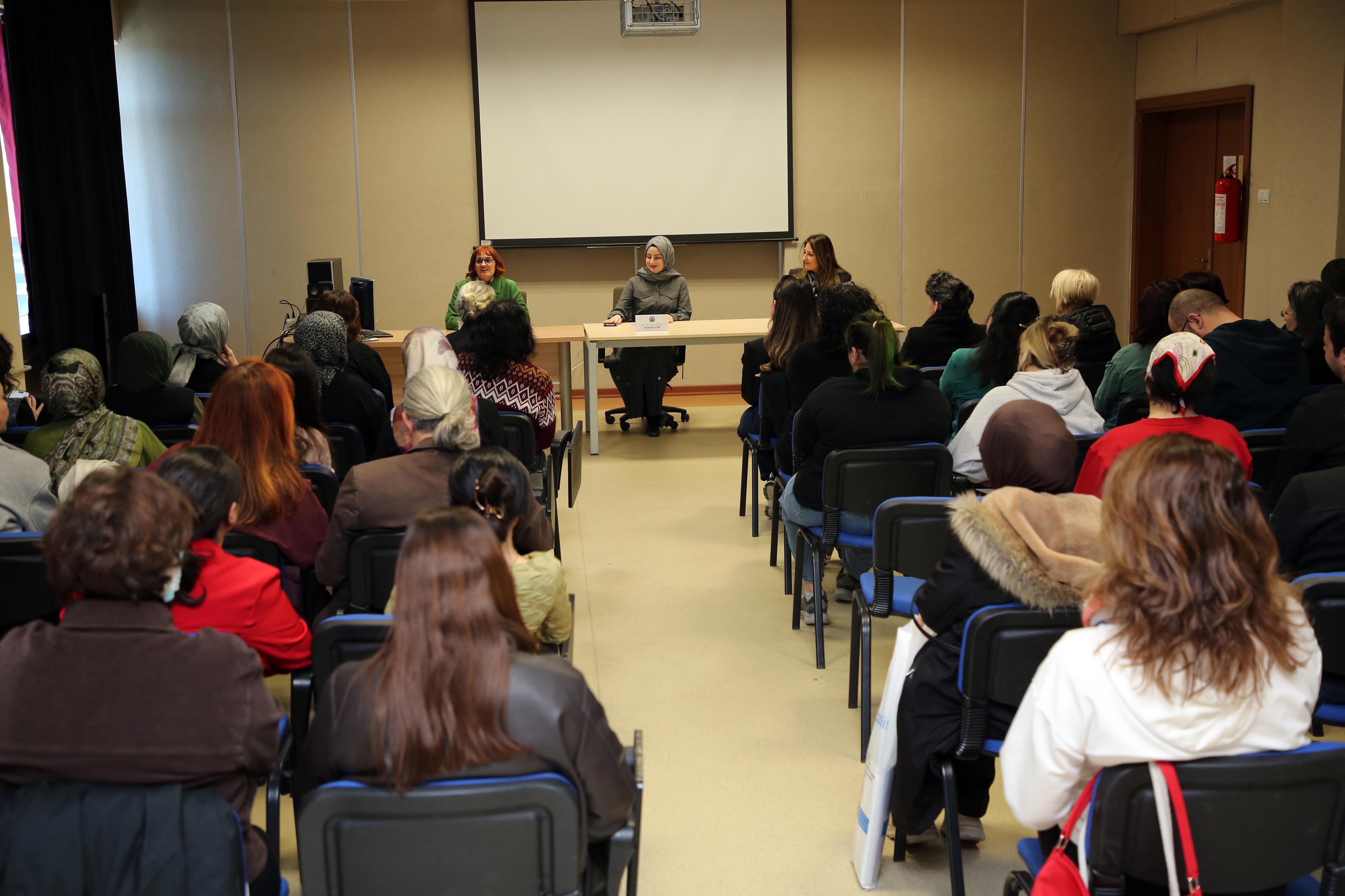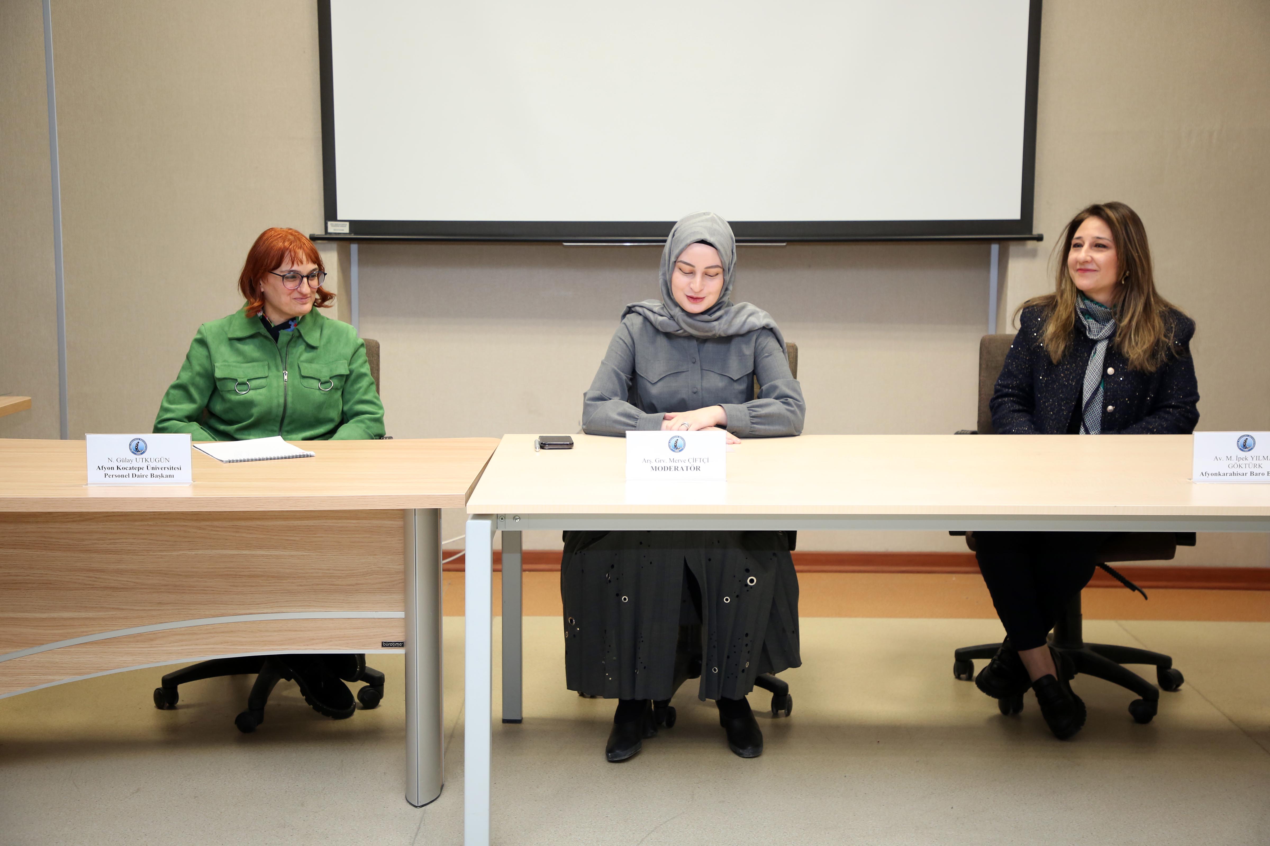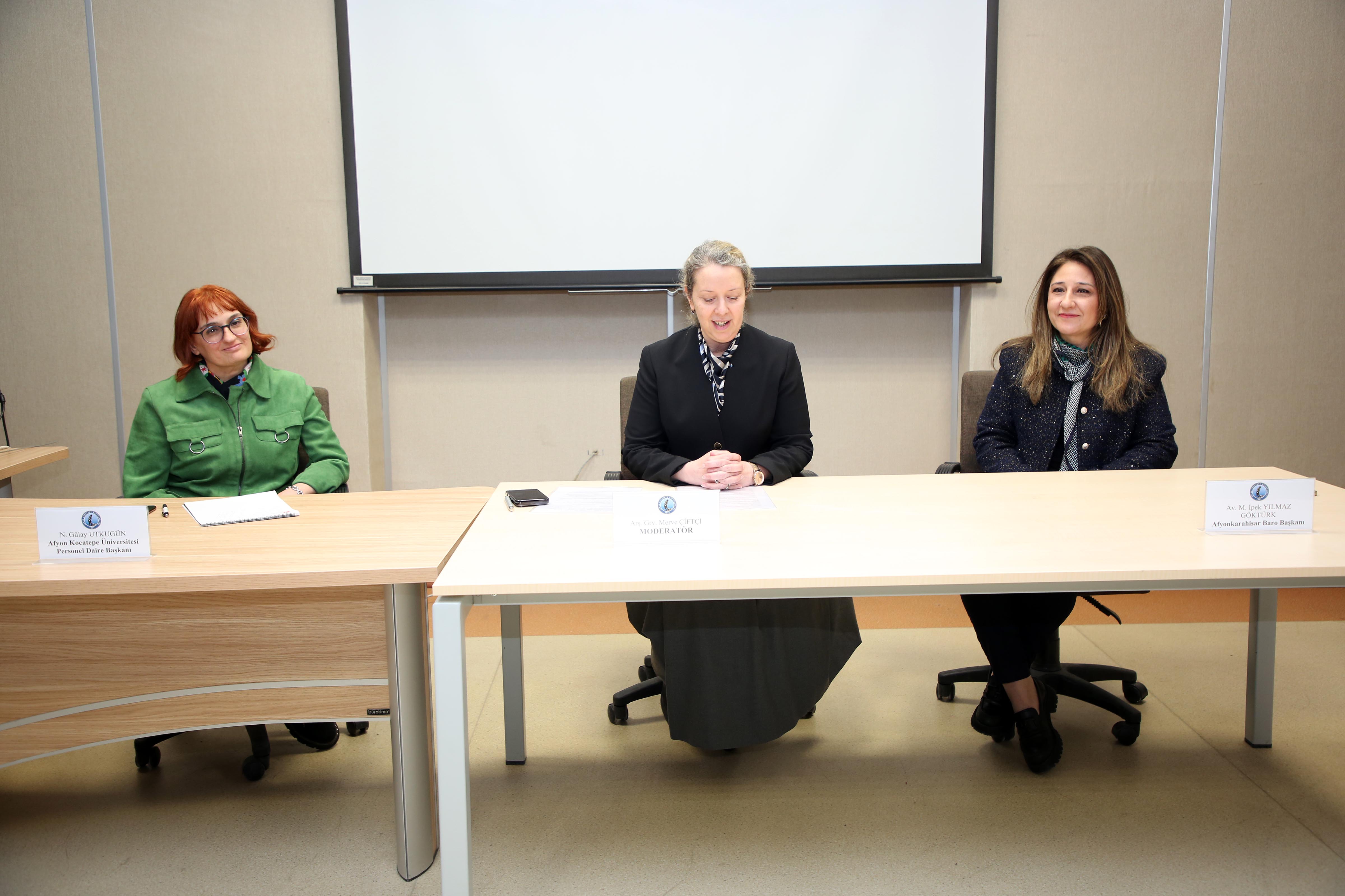 GSF Film İzleme Salonunda moderatörlüğünü GSF İç Mimarlık ve Tasarım Bölümü Arş. Gör. Merve Çiftçi’nin yaptığı panelde; Afyonkarahisar Baro Başkanı Av. Melahat İpek Yılmaz Göktürk ve AKÜ Personel Daire Başkanı Naciye Gülay Utkugün konuşmacı olarak yer aldı. Panele GSF Dekanı Prof. Dr. Şerife Ebru Okuyucu, Dekan Yardımcıları Dr. Öğretim Üyesi Sena Coşkun, fakülte sekreterleri, öğrenciler ile akademik ve idari personel katıldı.