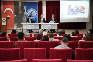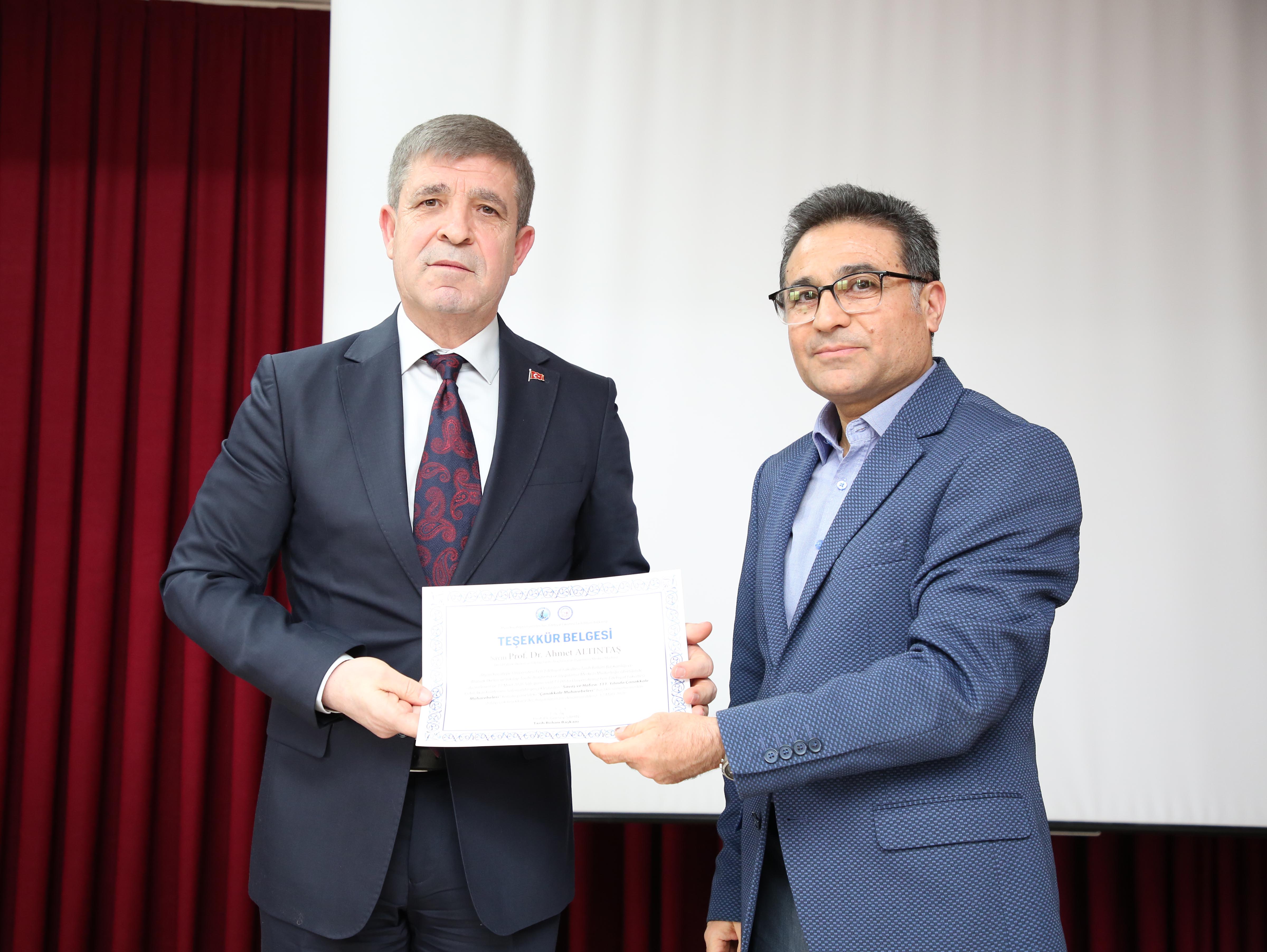 Açış konuşmasının ardından Atatürk İlkeleri ve İnkılap Tarihi Uygulama ve Araştırma Merkezi Müdürü ve Tarih Bölümü Öğretim Üyesi Prof. Dr. Ahmet Altıntaş’ın “Çanakkale Muharebeleri” konulu sunuma geçildi.  Çanakkale Savaşları’nın ortaya çıkmasının temel gerekçesinin I. Dünya Savaşı’nın sebepleri olduğunu kaydeden Altıntaş, “Osmanlı Devleti’nin parçalanması ve topraklarına el konulması, ayrıca emperyalist ülkelerin o dönemde enerji kaynaklarına sahip olma isteği şeklinde özetlenebilecek temel motivasyonlar bu süreci doğurmuştur. Bu nedenle İtilaf Devletleri ve İttifak Devletleri adı altında iki ayrı blok şeklinde bir yapılanma ortaya çıkmıştır” diye konuştu.