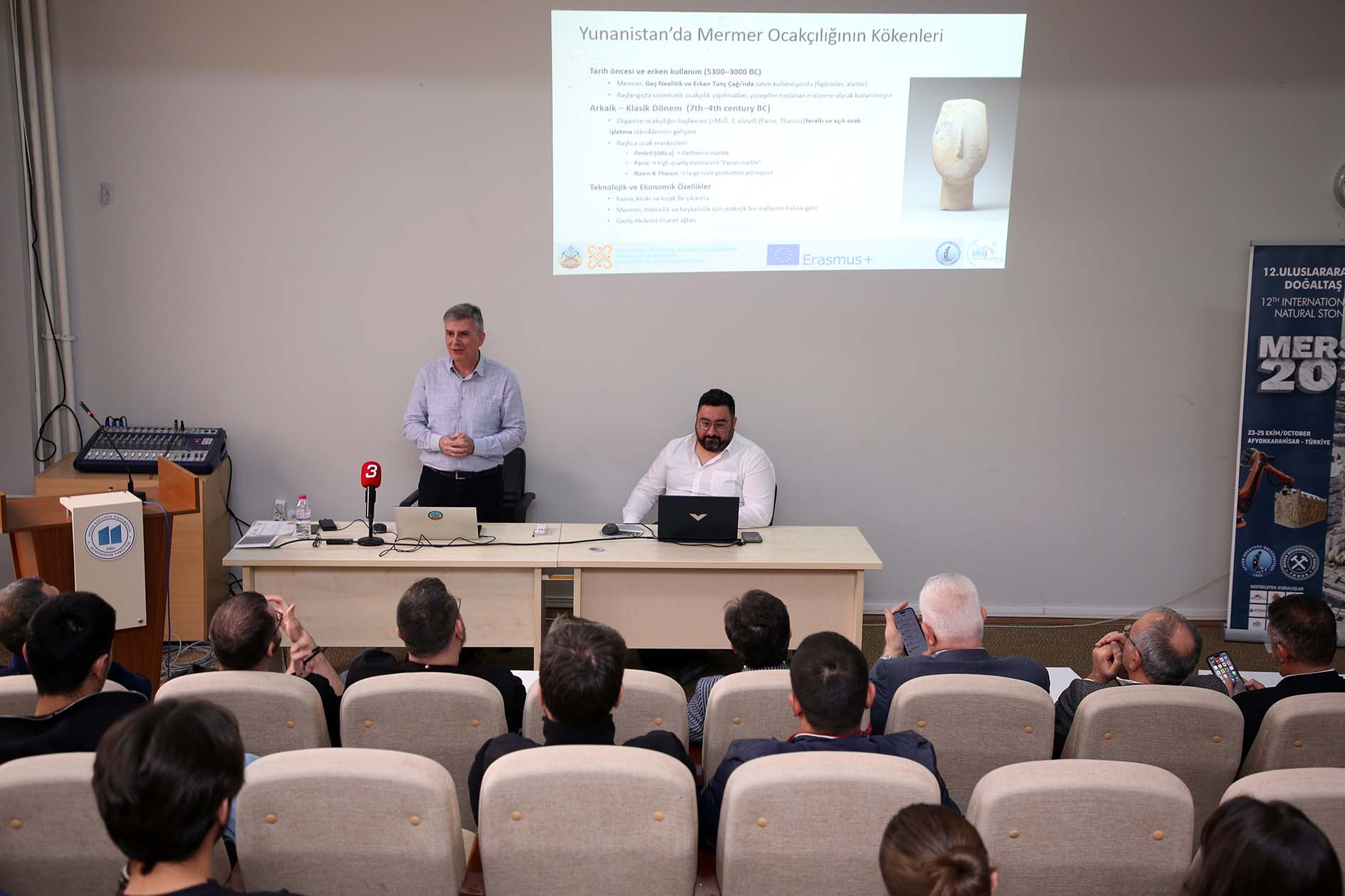 Mühendislik Fakültesi Maden Mühendisliği Bölümü Öğretim Üyesi Prof. Dr. İsmail Sedat Büyüksağiş yaptığı açış konuşmasında, Prof. Dr. Kapageridis’in Karadeniz kökenli olması nedeniyle de Türk kültürüne aşina olduğunu belirtti. Büyüksağiş, etkinlik kapsamında ise Kapageridis’in, Yunanistan’daki mermer ocaklarının konumları, üretim kapasiteleri, üretim yöntemleri ile lisanslama süreçleri ve çevresel koşullara ilişkin kapsamlı bilgiler paylaşacağını ifade etti. Sektör temsilcilerinin de programa davet edildiğini belirten Büyüksağiş, Yunanistan ile Türkiye’deki mermer madenciliği koşullarının karşılaştırılmasının önemli olduğunu söyledi. Bu karşılaştırmaların, sektörde karşılaşılan sorunlara ortak çözüm yolları geliştirilmesine katkı sağlayacağını ifade eden Büyüksağiş, 2025 yılı Ekim ayında gerçekleştirilen 12. Uluslararası Mermer ve Doğal Taş Kongresi’nde (MERSEM 2025) Ioannis Kapageridis ve ekibinin “En İyi Makale Ödülü”nü kazandığını kaydetti.
