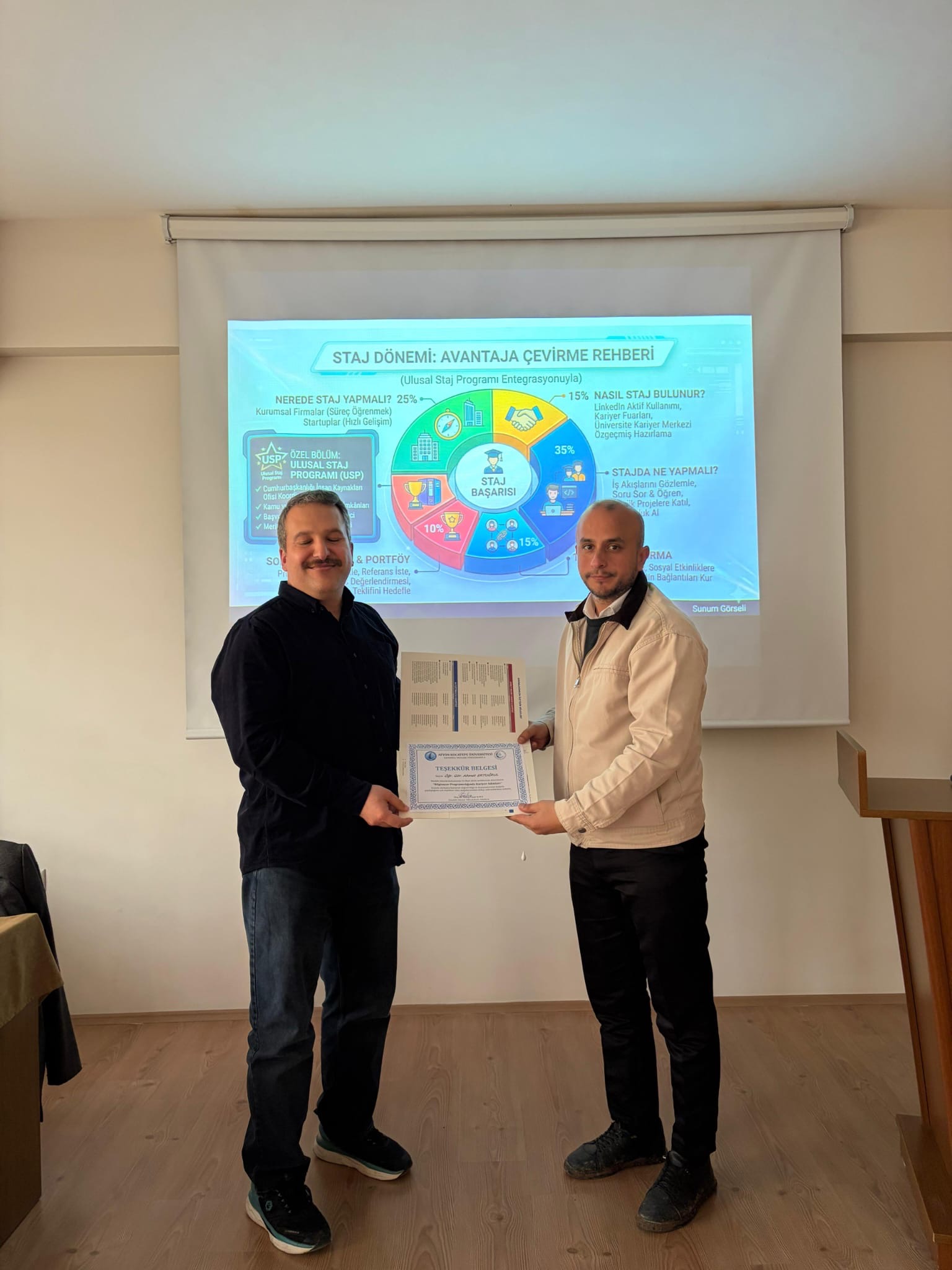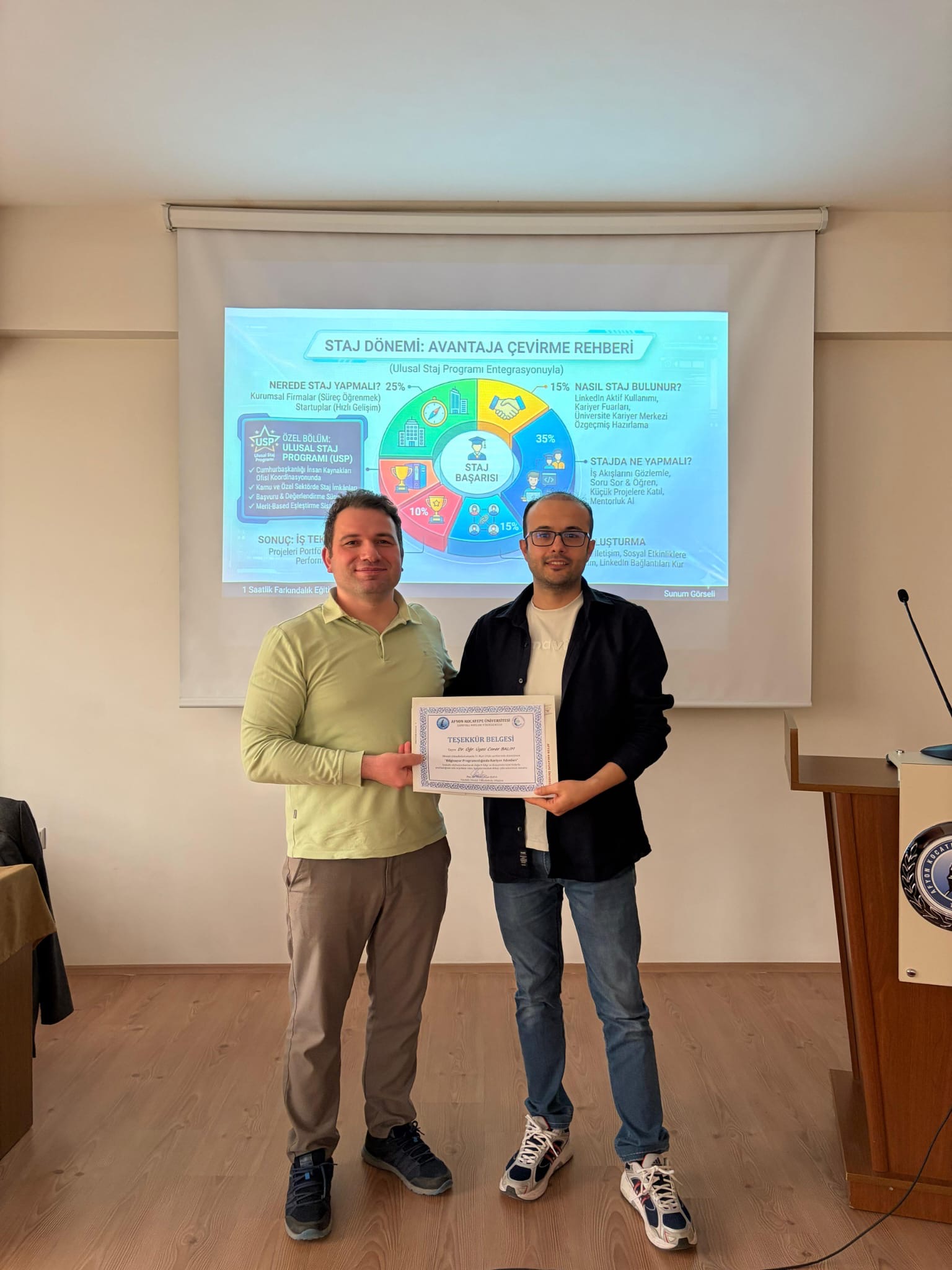 Söyleşi, Sandıklı MYO Müdür Yardımcıları Dr. Öğretim Üyesi İsmail Osmanoğlu ile Öğr. Gör. Orhan Özdemir tarafından konuşmacılara teşekkür belgelerinin takdim edilmesinin ardından sona erdi.