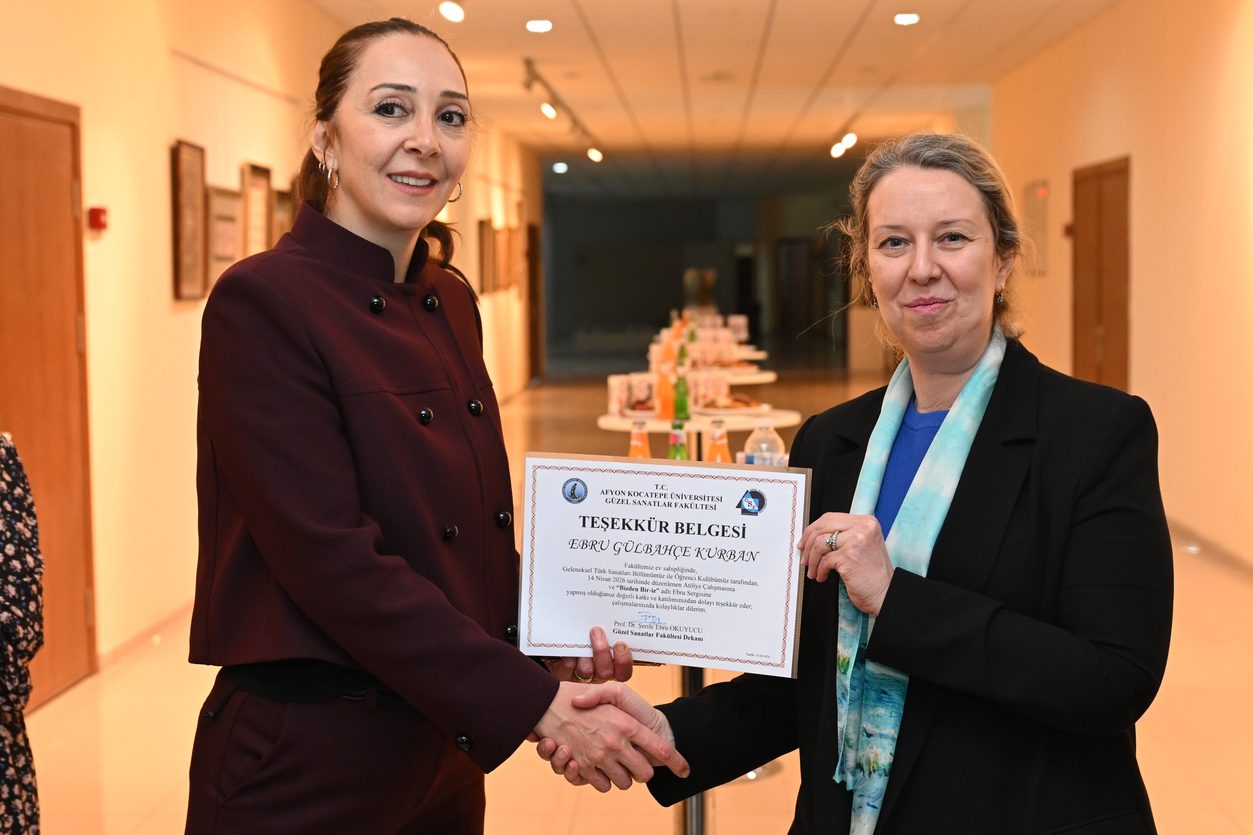 GSF Dekanı Prof. Dr. Şerife Ebru Okuyucu’nun açış konuşmasının ardından, sanatçı Ebru Gülbahçe Kurban’ın katılımcıları bilgilendirmesine müteakip açılan sergiye öğrenciler, öğretim elemanları ve Afyonkarahisarlı sanatseverler yoğun ilgi gösterdiler.