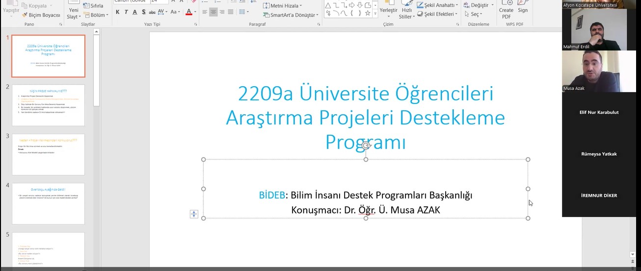 Afyon Kocatepe Üniversitesi (AKÜ) Sosyal Araştırmalar Uygulama ve Araştırma Merkezi, Fen Edebiyat Fakültesi Sosyoloji Bölümü ve Sandıklı Uygulamalı Bilimler Yüksekokulu Sosyal Hizmet Bölümü tarafından “TÜBİTAK 2209-A Lisans Öğrencileri İçin Proje Hazırlama” semineri düzenlendi.
