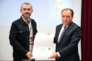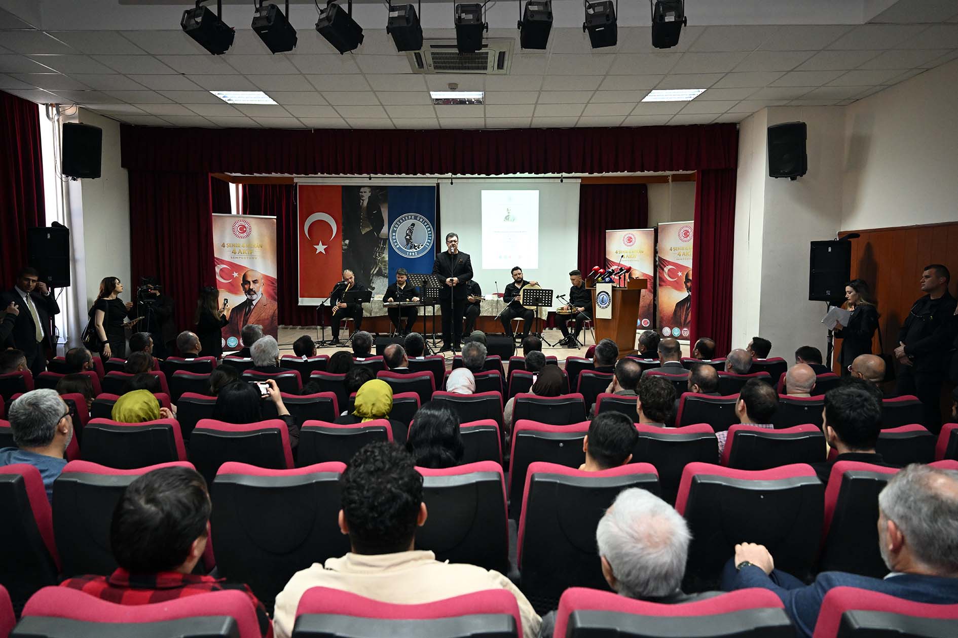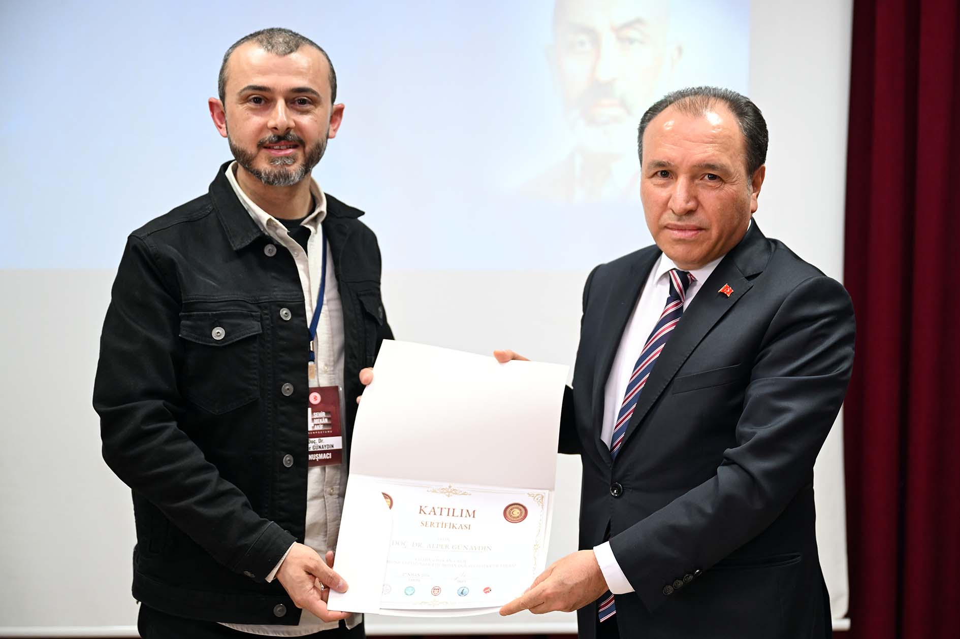 Fen Edebiyat Fakültesi Türk Dili ve Edebiyatı Bölümü Öğretim Üyesi Doç. Dr. Alper Günaydın ise “Bir Milli Kimlik Manifestosu Olarak İstiklal Marşı” konulu sunumunda, Mehmet Akif Ersoy’un Fransız Devrimi sonrasında hız kazanan uluslaşma sürecinin Osmanlı üzerindeki etkilerini çok iyi gözlemleyen bir aydın olarak, millî kimlik meselesini Millî Mücadele’nin merkezine yerleştirdiğini dile getirdi. Günaydın, “Bu dönemde imparatorluklar çözülürken, millî marş, bayrak, tarih ve ortak hafıza gibi unsurlar yeni kimlik inşasının temel bileşenleri hâline gelmiştir. Millî kimlik, ‘ortak geçmiş, ortak gelecek, ortak kültür ve ortak hafıza’ etrafında şekillenen bir aidiyet duygusuna dayanır. Bu aidiyet, bireyi topluma bağlar ve sorumluluk bilinci kazandırır. Eğitim, aile, çevre ve özellikle tarih anlatımı bu kimliğin oluşmasında belirleyici rol oynar” ifadelerini kullandı.