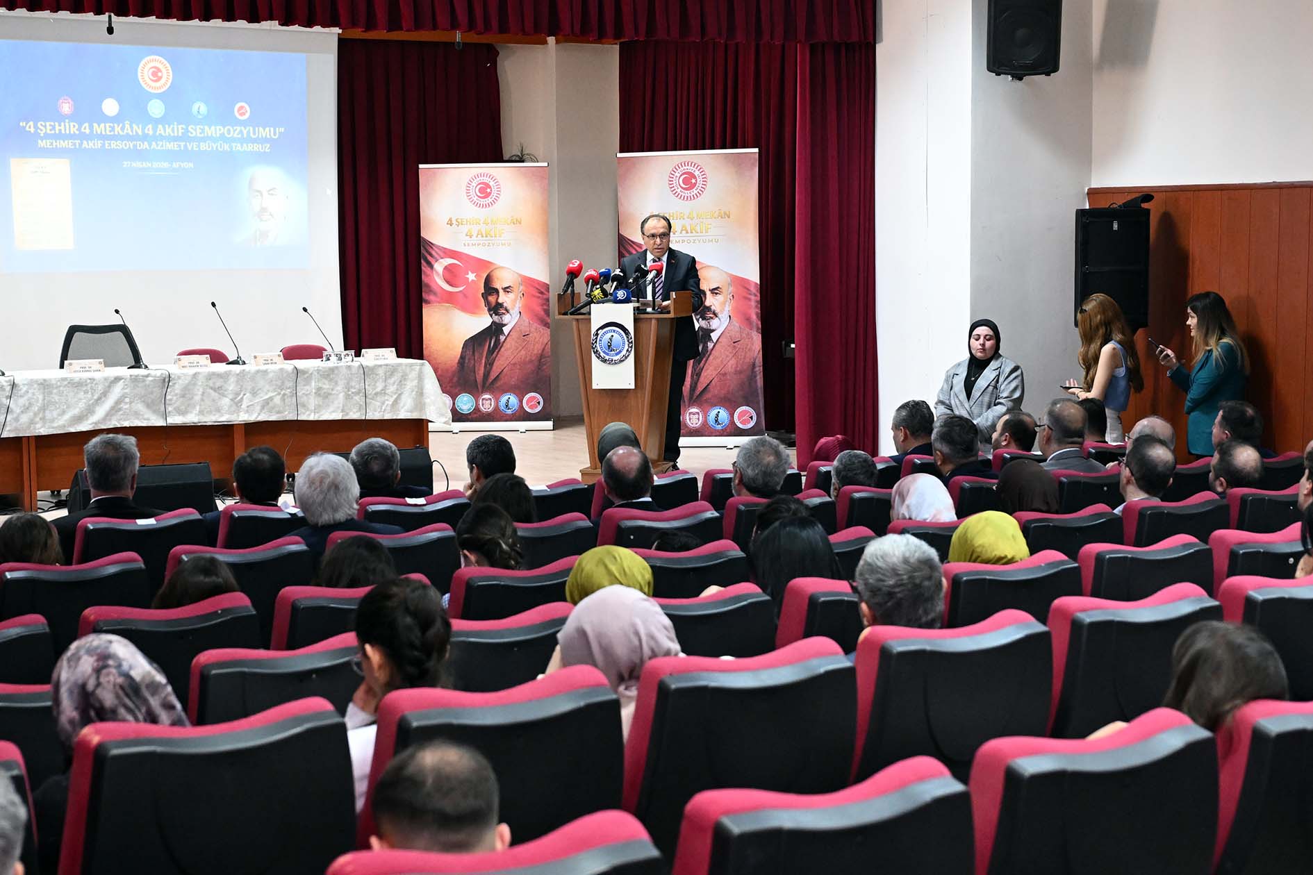 AKÜ Rektörü Prof. Dr. Mehmet Karakaş, Mehmet Akif Ersoy’un, milletin sinesinden çıkan, Anadolu coğrafyasının en karanlık ve en buhranlı günlerinde umudun ve dirilişin sesi olduğunu belirtti. Akif’in bir dava adamı olduğunu kaydeden Karakaş, “Bazı şahsiyetler vardır ki yalnızca yaşadıkları çağı değil, kendilerinden sonraki asırları da aydınlatan birer kutup yıldızı gibidirler. Milli Şairimiz ve büyük mütefekkirimiz Mehmet Akif de bu nitelikteki müstesna şahsiyetlerden biridir” dedi. Savaşların yalnızca meydanlarda kılıçla, tüfekle, topla kazanılmadığını, bir savaşın asıl kazanıldığı yerin milletin sinesi, inancı ve sarsılmaz iradesi olduğunu belirten Karakaş,  “İşte Mehmet Akif, Anadolu’yu karış karış gezerek yürüttüğü irşat faaliyetleriyle milletimizin düştüğü yerden kalkıp esareti reddetmesinde ve istiklale yürümesinde en büyük manevi mimarlardan biri olmuştur. Onun cami kürsülerinden, meydanlardan ve matbuat üzerinden yükselen gür sesi, cephedeki askerin süngüsü kadar keskin, Anadolu insanının duası kadar kuşatıcı bir etki yaratmıştır” diye konuştu.