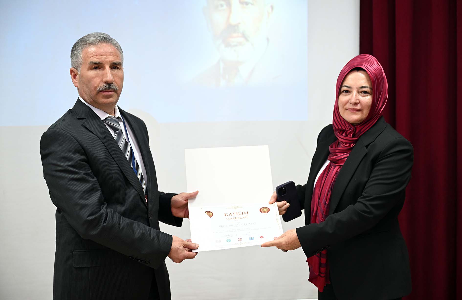 Fen Edebiyat Fakültesi Tarih Bölümü Öğretim Üyesi Prof. Dr. Feyza Kurnaz Şahin “Akif’in Leyla’sından İslam’ın Büyük Zaferine: Mehmet Akif Ersoy’un Perspektifinden Büyük Taarruz” konulu sunumunda ise Mehmet Akif Ersoy’un, Osmanlı Devleti’nin son döneminde yetişmiş önemli bir mütefekkir, güçlü bir aydın ve II. Meşrutiyet Dönemi’nin etkili bir entelektüeli olduğunun çoğu zaman gözden kaçırıldığını kaydetti. Şahin, “Oysa Akif’e dikkatle bakıldığında, Meşrutiyet Dönemi ile Cumhuriyet Dönemi arasında güçlü bir fikrî ve ahlaki sürekliliği kendi şahsında taşıdığı açıkça görülür. Bu nedenle Milli Mücadele ve Büyük Taarruz perspektifini değerlendirirken, bu sürecin yalnızca askerî ve siyasî bir kırılma değil; aynı zamanda Meşrutiyet’ten Cumhuriyet’e uzanan düşünsel bir birikimin devamı ve harmanı olduğunu göz önünde bulundurmak gerekir” şeklinde konuştu.
