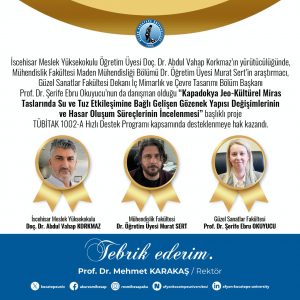 Afyon Kocatepe Üniversitesi (AKÜ) öğretim üyelerinin yer aldığı “Kapadokya Jeo-Kültürel Miras Taslarında Su ve Tuz Etkileşimine Bağlı Gelişen Gözenek Yapısı Değişimlerinin ve Hasar Oluşum Süreçlerinin İncelenmesi” başlıklı proje TÜBİTAK 1002-A Hızlı Destek Programı kapsamında desteklenmeye hak kazandı.